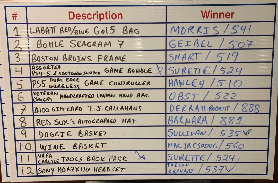 Thank you all for participating and helping us raise funds for the Post activities in the community. If you are a winner, you will receive a call from our POC: Sr. Vice CMDR Ken Lombardi to facilitate transfer of your winning item to you. You can reach Ken at (978) 479-5386.